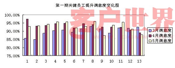 3-4月份的實(shí)施效果:13名客服代表的4月平均滿意度較3月份均值提升了3%,如下圖:
