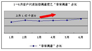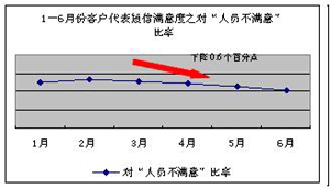客服代表的工作情緒及客戶滿意度呈現(xiàn)上升趨勢(shì):3-6月的短信滿意度穩(wěn)步提升(見(jiàn)下圖1),6月短信滿意度較3月提升1.25個(gè)百分點(diǎn),短信滿意度調(diào)查中“非常滿意”項(xiàng)占比自4月份開(kāi)上升1.42個(gè)百分點(diǎn)(見(jiàn)下圖2)。從客戶不滿意原因情況看,由于人員導(dǎo)致客戶不滿意的比例下降0.6%(見(jiàn)下圖3);對(duì)導(dǎo)致人員不滿意的原因分析可知,話務(wù)員服務(wù)態(tài)度不好的占比有明顯的下降(見(jiàn)下圖4)。
