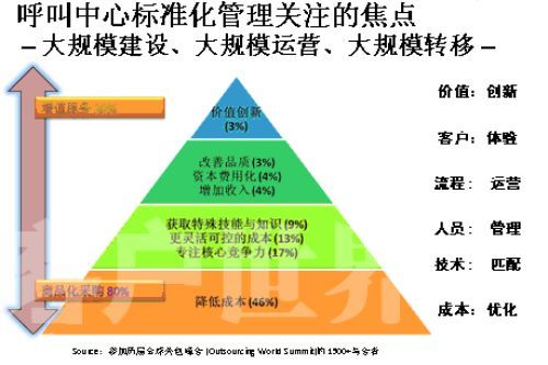 那么,對(duì)于這個(gè)尚處在”嬰兒潮”時(shí)期的產(chǎn)業(yè),我們最應(yīng)該做些什么來呵護(hù)和培育這個(gè)產(chǎn)業(yè)健康有序的發(fā)展?大家要好好呵護(hù)這個(gè)行業(yè)。如果只是強(qiáng)調(diào)“要想讓呼叫中心發(fā)展,那就需要我們多投錢,這樣就能買許多機(jī)器,放在公司里面。規(guī)格有了,那呼叫中心就發(fā)展了!蔽矣X得這樣的說法是對(duì)呼叫中心發(fā)展的錯(cuò)誤理解。我們這個(gè)標(biāo)準(zhǔn)是希望營(yíng)建專業(yè)化的產(chǎn)業(yè),整個(gè)呼叫中心產(chǎn)業(yè)的價(jià)值金字塔,這個(gè)金字塔每年在美國(guó)有一個(gè)專場(chǎng),就叫呼叫中心專場(chǎng),標(biāo)志一個(gè)產(chǎn)業(yè)成熟的金字塔是怎樣的。通過調(diào)查發(fā)現(xiàn),當(dāng)產(chǎn)業(yè)進(jìn)入成熟階段,標(biāo)準(zhǔn)化服務(wù)的第一個(gè)就是降低成本,也就是提高生產(chǎn)效益,能夠把這個(gè)產(chǎn)業(yè)細(xì)化分解,高度的模塊化進(jìn)行精細(xì)控制的時(shí)候,其他的差異化的體現(xiàn)。呼叫中心本身是不是成為企業(yè)核心競(jìng)爭(zhēng)力的一部分,或者說越來越成熟的外包商出現(xiàn),能夠把一些企業(yè)非核心競(jìng)爭(zhēng)力加入到自己的核心競(jìng)爭(zhēng)力之上,這叫專業(yè)化。還有一個(gè)更加靈活可控的成本,呼叫中心的彈性從一百人到一千人,一千人到三千人的發(fā)展更加可控。還有獲得特殊技能與知識(shí),事實(shí)上呼叫中心各行各業(yè)知識(shí)都會(huì)接觸,你只有專著才能做得更好,本身對(duì)于呼叫中心的從業(yè)人員來說,在這個(gè)產(chǎn)業(yè)中扮演的角色不是締造一個(gè)企業(yè)的核心競(jìng)爭(zhēng)力,怎么期望從業(yè)人員掌握更多的技能和知識(shí),來指導(dǎo)更多的行業(yè)和企業(yè)。特別是在客戶導(dǎo)向上面的發(fā)展,還有在金字塔上面增加收入,分析客戶所需,讓我們更好的滿足客戶的需求;然后資本費(fèi)用化,從外包專業(yè)化領(lǐng)域帶來的變化,很多的時(shí)候最大的一筆建設(shè)是呼叫中心,基本一個(gè)中等的呼叫中心沒有500萬以上的資金投入是不可想象的。