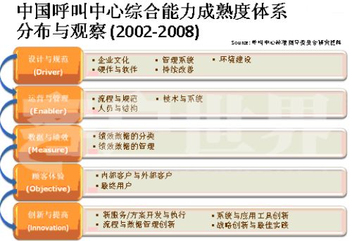 在過去幾年我們也做了很多研究,一個(gè)呼叫中心整合持續(xù)建設(shè)在哪些方面應(yīng)該做定義;旧衔覀兪欠譃槲鍌(gè)方面,在每一級(jí)的成熟度方面,我們的呼叫中心都關(guān)注自己的成熟度。1、設(shè)計(jì)與規(guī)范;2、運(yùn)營(yíng)管理;3、數(shù)據(jù)與績(jī)效;4、顧客體驗(yàn);5、創(chuàng)新與提高。第五方面創(chuàng)新與提高在CMM模型中是特有的,它在整個(gè)產(chǎn)業(yè)的發(fā)展過程中,提供戰(zhàn)略革新和戰(zhàn)略工具一體化使用的指導(dǎo)框架和最佳實(shí)踐。