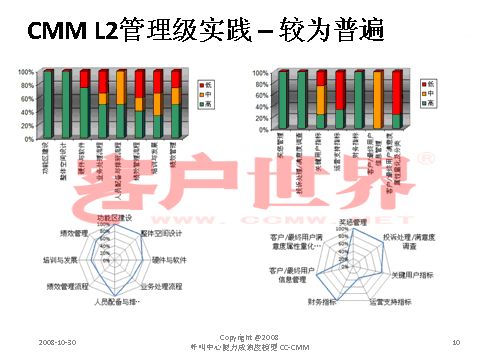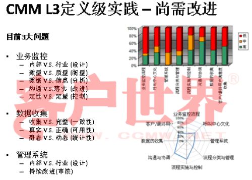 接下來我用一個(gè)很小的案例結(jié)束今天的分享,我們整個(gè)的呼叫中心的成熟度模型目前是在電信行業(yè)開始了2008年版的推廣,成熟度模型經(jīng)歷從07年成立亞太呼叫中心產(chǎn)業(yè)聯(lián)盟以后,由一群這個(gè)行業(yè)里面的專家,特別是中國(guó)產(chǎn)業(yè)市場(chǎng)的發(fā)展建立起的標(biāo)準(zhǔn),一年以來在通信行業(yè)我們做的能力成熟度的判定有一些很有意思的啟示,通信行業(yè)占到我們整個(gè)呼叫中心產(chǎn)業(yè)約70%的坐席,是最大的、最有代表性的產(chǎn)業(yè)。做下來真的很有代表性,普遍性在于環(huán)境建設(shè)、資產(chǎn)投入、資產(chǎn)配置,所以這下面的雷達(dá)就可以看到,相對(duì)完善都是在環(huán)境建設(shè),功能區(qū)建設(shè),整體空間設(shè)計(jì)、硬件相對(duì)來說比較偏硬的一些。在其他方面偏廢的比較厲害。第二個(gè)雷達(dá)在一些獎(jiǎng)懲管理、信息管理,整個(gè)軟性方面幾乎有很濃重的一些計(jì)劃經(jīng)濟(jì),制造行業(yè)的一些領(lǐng)域相對(duì)來說比較成熟。我們目前看到的,基本上通信行業(yè)的一些發(fā)展在能力成熟度上是二級(jí)到四級(jí),尤其以二到三級(jí)的發(fā)展更為普遍。通常的方法為期一周的標(biāo)桿調(diào)研,看所有的呼叫中心發(fā)展的五個(gè)方面,我們才會(huì)在里面做這樣的判定。在能力成熟度的三級(jí),我們做了一些企業(yè)發(fā)現(xiàn),特別在三級(jí),關(guān)于能不能對(duì)流程進(jìn)行一致性管理方面,就是剛才李老師講到的不是最急的,而管理是最重要的?赡芩械牧鞒潭喽嗌偕儆幸恍┏墒於鹊膯栴},但是我們的源頭流程能力在三個(gè)方面有很大的差距:一個(gè)是業(yè)務(wù)監(jiān)控流程,第二個(gè)數(shù)據(jù)收集流程,還有一個(gè)是管理系統(tǒng)的審核流程。這個(gè)大家可以和自己的呼叫中心比一比。