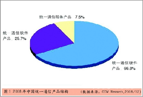 從產(chǎn)品結(jié)構(gòu)角度分析,雖然受硬件設備價格因素的影響,統(tǒng)一通信設備市場仍然是通信市場中最大份額的一部分,市場份額占到66.8%。而且隨著企業(yè)用戶對于統(tǒng)一通信理解能力的加深,統(tǒng)一通信軟件產(chǎn)品與統(tǒng)一通信服務越來越受到更多企業(yè)的認同。與2007年相比,統(tǒng)一通信軟件和服務產(chǎn)品市場份額有一定比例的增加。2008年,統(tǒng)一通信軟件產(chǎn)品達到市場份額的25.7%,特別是統(tǒng)一通信服務產(chǎn)品,增長迅速,市場份額超過7.5%。