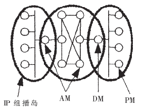 混合式組播的核心任務(wù)是為AM完成拓?fù)?包括數(shù)據(jù)拓?fù)浜涂刂仆負(fù)?的構(gòu)建。由于網(wǎng)絡(luò)狀況的動態(tài)性,以及客戶端數(shù)量與客戶端加入系統(tǒng)時間的不確定性,當(dāng)前的應(yīng)用層組播方案一般需要每個結(jié)點定期與其他全部或一定比例的結(jié)點交換控制信息,以了解其他結(jié)點的狀態(tài),形成控制拓?fù)?保障數(shù)據(jù)拓?fù)涞慕研浴T诮Y(jié)點個數(shù)逐漸增加時,網(wǎng)絡(luò)上的控制信息數(shù)量會占用大量的帶寬資源。應(yīng)用層組播的數(shù)據(jù)拓?fù)淇煞譃槎箢?信源樹和共享樹。信源樹必須為每個組播源保存路由信息,這樣會占用大量的系統(tǒng)資源。共享樹傳輸延時較大。IP視頻會議系統(tǒng)屬于實時交互應(yīng)用,視音頻數(shù)據(jù)占據(jù)很大的帶寬,并且對端到端傳輸延遲和網(wǎng)絡(luò)抖動的要求很高,需要尋找一種既可以減少交換控制信息又可以保證視音頻數(shù)據(jù)實時傳輸?shù)耐負(fù)錁?gòu)建方式。為利用排列圖的優(yōu)越特性(如結(jié)點和邊的對稱性、故障恢復(fù)能力和容錯能力、可以嵌入獨立的組播樹等),這里采用分層排列圖的結(jié)構(gòu)來組織混合式組播中的AM。