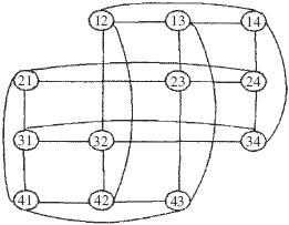 一個排列圖實例A4,2的拓?fù)浣Y(jié)構(gòu)如圖2所示。排列圖An,2僅能容納n(n-1)個主機。為使系統(tǒng)可容納任意多主機,可將參與主機組合成多個An,2結(jié)構(gòu),這些An,2按照樹形結(jié)構(gòu)連接在一起,稱為分層排列圖結(jié)構(gòu)[6]。