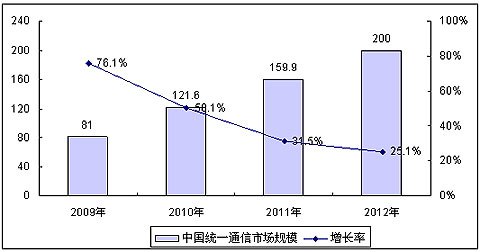 賽迪顧問預(yù)測,伴隨著全球經(jīng)濟(jì)的逐漸復(fù)蘇和企業(yè)對統(tǒng)一通信產(chǎn)品認(rèn)識與需求的持續(xù)增長,2009年中國統(tǒng)一通信市場將出現(xiàn)加速增長的趨勢,全年市場規(guī)模將達(dá)81億元,同比增長76.1%,至2012年,中國統(tǒng)一通信整體市場規(guī)模將達(dá)200億元,平均年增長率超過30%。