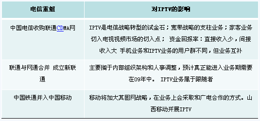 三網(wǎng)融合從十五大起就已經(jīng)被列入了發(fā)展目標(biāo),無(wú)論是廣電和電信,都在期望自己成為未來(lái)三網(wǎng)融合的主導(dǎo)者。廣電在08年和科技部合作推出了NGB下一代廣播網(wǎng)的建設(shè)。而《電信法》則是電信的政策機(jī)遇。根據(jù)電信法的規(guī)定,會(huì)成立三網(wǎng)融合的監(jiān)管機(jī)構(gòu)。電信要想掌握主動(dòng)權(quán),必須在三網(wǎng)融合的相關(guān)業(yè)務(wù)中充分證明其實(shí)力,IPTV作為三網(wǎng)融合的代表業(yè)務(wù),其發(fā)展?fàn)顩r,將關(guān)系到電信在未來(lái)三網(wǎng)融合中的主導(dǎo)權(quán)。