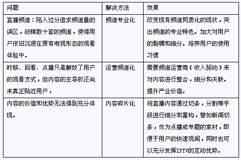 IPTV發(fā)展中,傳統(tǒng)視頻業(yè)務(wù)既是切入點(diǎn),同時(shí)也是業(yè)務(wù)收入的重要來(lái)源。但目前視頻業(yè)務(wù)的價(jià)值還未得到充分體現(xiàn);(dòng)性優(yōu)勢(shì)還未得到充分挖掘。