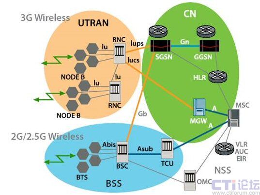 (RNC) 這一元素。在 3G UMTS 網(wǎng)絡(luò)中,RNC 可執(zhí)行無線電資源管理、移動(dòng)管理和加密功能,它可通過媒體網(wǎng)關(guān)連接至電路交換核心網(wǎng)絡(luò),實(shí)現(xiàn)電路交換語音服務(wù),此外,它還可連接至數(shù)據(jù)包交換核心網(wǎng)絡(luò)中的