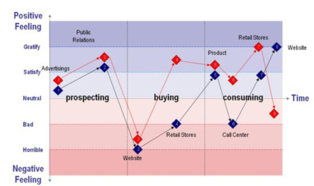 看一看“情感曲線”也許你就會(huì)頓悟。此處所示的兩條曲線來自兩個(gè)國際銀行。請注意曲線的不同之處。紅線所示的銀行與藍(lán)線所示的銀行相比在呼叫中心服務(wù)和店內(nèi)體驗(yàn)上都要略勝一籌。而藍(lán)線所示銀行在網(wǎng)上銀行這一項(xiàng)上表現(xiàn)更好!凹t線”銀行的競爭資本是其卓越的客戶互動(dòng)體驗(yàn),無論是分行的面對面互動(dòng)還是來自聯(lián)絡(luò)中心的遠(yuǎn)程體驗(yàn)都屬一流。