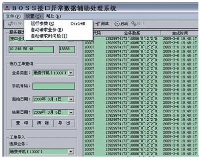 利用BOSS接口異常數(shù)據(jù)輔助處理系統(tǒng)執(zhí)行以上應(yīng)急流程的方式是:在提取號碼后,根據(jù)客服協(xié)議開機(jī)命令字10007格式要求(HandsetNo~工號~返回格式~nCode~sType~備注),將批量號碼構(gòu)造成報(bào)文列表并導(dǎo)入系統(tǒng)執(zhí)行。主界面如圖5所示。