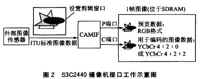 YCbCr8比特標準的圖像數據輸入,最大可采樣4096×4096像素的圖像。攝像頭接口可以有兩種模式與DMA控制器進行數據傳輸:一種是P端口模式,把從攝像頭接口采樣到的圖像數據轉為RGB數據,并在DMA控制下傳輸到SDRAM(一般這種模式用來提供圖像預覽功能);另一種是C端口模式,把圖像數據按照YCbCr4:2:0或4:2:2的格式傳輸到SDRAM(這種模式主要為MPEG-4、H.263等編碼器提供圖像數據的輸入)。上述兩種工作模式都允許設置一個剪輯窗口,只有進入這個窗口的圖像數據才能夠傳輸到SDRAM。上述過程可用圖2說明。