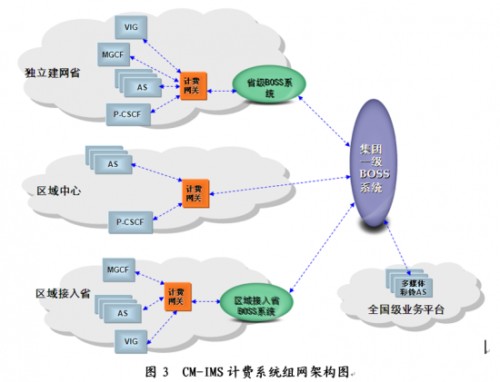 為了降低設(shè)備投資風(fēng)險(xiǎn),CM-IMS在部署初期采用分省和區(qū)域中心相結(jié)合的組網(wǎng)方案,并設(shè)置全國(guó)級(jí)業(yè)務(wù)平臺(tái)。CM-IMS計(jì)費(fèi)系統(tǒng)組網(wǎng)架構(gòu)如圖3所示。