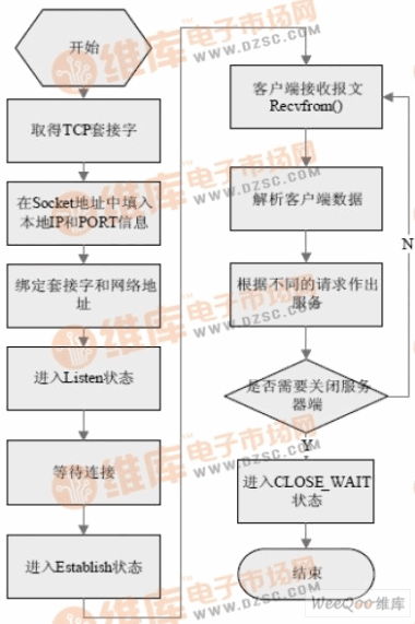 處理抽象。本應(yīng)用中需要派生一個(gè)QTcp 類,實(shí)現(xiàn)傳輸層的TCP 協(xié)議。一般基于 TCP 的網(wǎng)絡(luò)應(yīng)用程序都要繼承QTcp 類,然后在ESTABLISHED 狀態(tài)中添加 子狀態(tài)完成特定的功能。在服務(wù)器端,利用量子框架實(shí)現(xiàn)一個(gè)QServer 類,是一個(gè)活動(dòng)對象,繼承自QTcp 類。QServer 活動(dòng)對象同客戶端TCP Socket 連接后,進(jìn)入ESTABLISHED狀態(tài)中,通過調(diào)用Recvfrom 函數(shù)接收客戶端的請求,然后解析請求的服務(wù)類型,根據(jù)不同請求做出不同的服務(wù)。其軟件流程圖如圖1 所示: