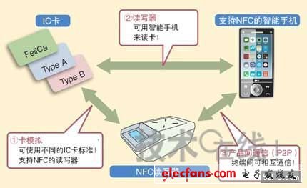 NFC具有“卡模擬”、“讀寫器模擬”以及“產(chǎn)品間通信(P2P)”三種功能。