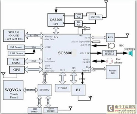 方案集成度高、設(shè)計簡潔:基于SC8800、QS3200和SC6600V的設(shè)計方案框圖如下圖,僅三顆主芯片就實現(xiàn)了TD-SCDMA多媒體功能手機(jī)電視方案,方案公司硬件設(shè)計方便。