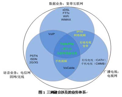 這種沖擊表現(xiàn)在信息通信領(lǐng)域的“時(shí)移事易”上,一個(gè)是在時(shí)間維度上,一個(gè)是在影響產(chǎn)業(yè)發(fā)展重大事件的維度上。其長(zhǎng)期累積的結(jié)果是,當(dāng)前全球范圍內(nèi)影響最大、最深遠(yuǎn)的莫過于寬帶網(wǎng)絡(luò)成為國(guó)家的信息化基礎(chǔ)設(shè)施。寬帶的普及深刻的影響和推動(dòng)了以TCP/IP為技術(shù)基礎(chǔ)的“三重播放”和在市場(chǎng)競(jìng)爭(zhēng)層面的“多重捆綁”業(yè)務(wù)營(yíng)銷策略,這構(gòu)成了三網(wǎng)融合最基本的內(nèi)容,隨之帶動(dòng)了近年已成為業(yè)界關(guān)注焦點(diǎn)的視頻業(yè)務(wù)向“一云三網(wǎng)多屏”的方向發(fā)展?傊,新技術(shù)和新產(chǎn)業(yè)發(fā)展導(dǎo)致傳統(tǒng)的電信業(yè)和廣播電視業(yè)從封閉逐步走向開放,渠道、內(nèi)容、消費(fèi)者偏好均從單一走向多元;對(duì)消費(fèi)者而言,信息的流動(dòng)從單向變?yōu)殡p向和多向,新媒體、全媒體、自媒體在社會(huì)上的份量快速上升。 而來自市場(chǎng)的需求變化是:過去那種內(nèi)容和服務(wù)緊密捆綁于網(wǎng)絡(luò)的業(yè)務(wù)模式被開放的互聯(lián)網(wǎng)沖擊得疲于招架,網(wǎng)絡(luò)和渠道的地位不斷下降,處于底層的網(wǎng)絡(luò)整合開始朝著契合于上層內(nèi)容和應(yīng)用整合的方向發(fā)展;內(nèi)容和應(yīng)用成為產(chǎn)業(yè)發(fā)展的新重心,傳統(tǒng)運(yùn)營(yíng)商在挖潛增效做好“智能管道”的同時(shí),也希望借助三網(wǎng)融合躋身綜合信息服務(wù)領(lǐng)域。表現(xiàn)在網(wǎng)絡(luò)層面,傳統(tǒng)的電信業(yè)務(wù)大范圍地向?qū)拵P網(wǎng)上遷移;傳統(tǒng)的有線電視網(wǎng)進(jìn)軍新媒體,“電信化”色彩越來越強(qiáng)。在業(yè)務(wù)層面,如下圖示所,典型的融合業(yè)務(wù)如有線寬帶、IPTV、VoIP、手機(jī)視頻、互聯(lián)網(wǎng)智能電視等成為雙方競(jìng)爭(zhēng)的主陣地。