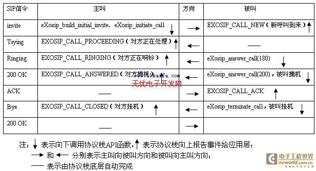 oSIP/eXosip對(duì)消息的報(bào)告有2種工作模式:事件模式和回調(diào)模式。本設(shè)計(jì)采用事件模式, 通過(guò)函數(shù)eXosip_event_wait定時(shí)輪詢獲取SIP事件。SIP信令的實(shí)現(xiàn)如表2 。