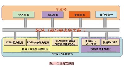 為了適應(yīng)全業(yè)務(wù)競爭的需要,長遠(yuǎn)規(guī)劃業(yè)務(wù)支撐系統(tǒng),移動采用SOA(Service Oriented architecture,面向服務(wù)的架構(gòu))技術(shù)對業(yè)務(wù)支撐系統(tǒng)進(jìn)行了改造,并把鐵通資源融合進(jìn)SOA架構(gòu),改造項(xiàng)目以業(yè)務(wù)支撐系統(tǒng)SOA架構(gòu)為基礎(chǔ),進(jìn)行寬帶業(yè)務(wù)合營和IPPBX固話業(yè)務(wù)合營,構(gòu)建基于SOA架構(gòu)的一體化服務(wù)營銷支撐體系。