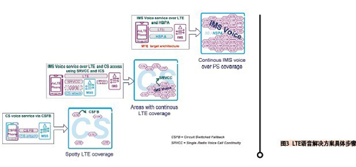 讓我們來看看主流運(yùn)營商在LTE時代有哪些語音解決方案可以挑選,以及它們的優(yōu)劣比較(見表1)。圖3為實(shí)現(xiàn)LTE語音解決方案的具體步驟。