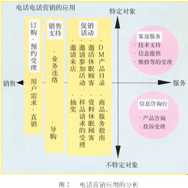 ——圖2表示以電話營銷的目的及對象為軸分析電話營銷的應(yīng)用?v軸為對象,分為“特定”和“不特定”,橫軸為目的,分為“服務(wù)”和“銷售”。這樣右上區(qū)域=“特定對象X服務(wù)”,即為客戶服務(wù),右下區(qū)域=“不特定對象X服務(wù)”,對應(yīng)信息咨詢;左側(cè)為銷售。從對象來看,服務(wù)更偏重于“特定對象”。從目的來看,訂購/預(yù)約受理是最直接的銷售行為,所以放在最左,銷售支持在中間,促銷活動(dòng)靠右。