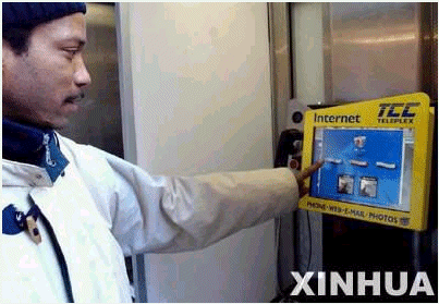 在美國紐約曼哈頓,一名男子正在使用網(wǎng)絡(luò)公用電話。美國第一部戶外網(wǎng)絡(luò)公用電話2月10日在紐約街頭開始試用。