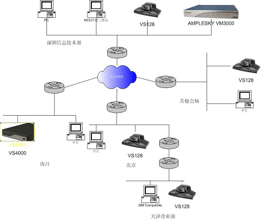 江南證券有限責任公司骨干帶寬為512K,由于IP損耗,真正能建立的會議帶寬為384K。由于為本次視頻會議系統(tǒng)配置的Amplesky公司的VM3000可支持8用戶512K會場,即使將來帶寬增加,需建立512K帶寬會議時也能滿足需要,無需再投資。當會議規(guī)模需要擴大時,只需購買升級軟件,而無需再投資硬件設(shè)備,VM3000可擴展到支持36用戶。