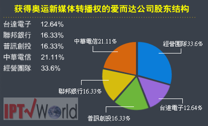據(jù)IPTVWorld了解,2008年第29屆北京奧運比賽轉(zhuǎn)播權(quán)臺灣區(qū)網(wǎng)絡與手機平臺轉(zhuǎn)播權(quán)。國際奧委會 (IOC)除了證實這項消息,也表示,經(jīng)過度。另外,鑒于愛爾達在美國職棒等運動賽事和韓劇等數(shù)字內(nèi)容版權(quán)經(jīng)營與后制服務擁有豐富的實務經(jīng)驗,中華電在今年4月進一步以溢價參與愛爾達增資,取得21%的股權(quán),成為愛爾達除了經(jīng)營團隊外最大的股東。