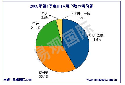 《2008年第1季度中國IPTV市場季度監(jiān)測》數(shù)據(jù)顯示,2008年第1季度中國IPTV累計用戶數(shù)達131萬人。根據(jù)各廠商中標業(yè)務區(qū)實際發(fā)展的用戶數(shù)排名,UT斯達康、威科姆、中興通訊位居前三。2008年第1季度IPTV廠商的競爭格局沒有顯著變化。