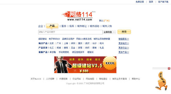 原網(wǎng)絡(luò)114 “轉(zhuǎn)讓”、“求購”、“招聘”、“應(yīng)急貼”、“商問”和“反查”等六大主打欄目不見了,取而代之的是“服務(wù)”、“場所”、“城市轉(zhuǎn)讓”、“城市活動(dòng)”、“城市人物”等五欄目。據(jù)了解,第六欄目‘城市批發(fā)’由于數(shù)據(jù)整理問題,不參加公測,將被安排隨后直接上線,奧運(yùn)會(huì)帶來的巨大客流,對生活資訊黃頁的需求也隨之放大,巨大的需求也意味著生活資訊類網(wǎng)站巨大的發(fā)展機(jī)遇。7月初,谷歌把還處于測試期的生活搜索入口提到了中國首頁,與視頻、圖片、地圖等并稱谷歌中國八大重點(diǎn)業(yè)務(wù)之一。近日,雅虎口碑網(wǎng)也高調(diào)上線。