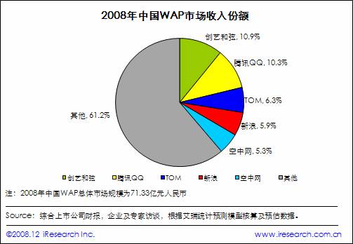 艾瑞咨詢研究發(fā)現(xiàn),08年WAP市場集中度較2007年有所提升,TOP5廠商占據(jù)份額已達38.8%,其中創(chuàng)意和弦、騰訊QQ、TOM分別以10.9%、10.3%和6.3%的比例位居前三。