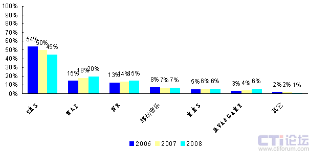 圖1 2006~2008年中國(guó)移動(dòng)數(shù)據(jù)業(yè)務(wù)市場(chǎng)結(jié)構(gòu)(單位:%)