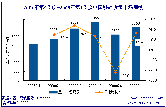 2009年第1季中國移動搜索市場收入達3050萬,環(huán)比增長16%