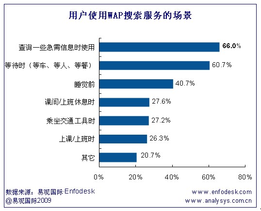 根據(jù)易觀Enfodesk《中國移動(dòng)搜索市場用戶調(diào)研報(bào)告2009》研究發(fā)現(xiàn),用戶使用WAP搜索服務(wù),一般情況是在查詢一些急需信息和等待時(shí)(等車、等人、等餐),這兩類情形的使用比例均在60%以上。值得注意的是,在睡覺前,用戶使用移動(dòng)搜索服務(wù)的比例達(dá)40.7%。而在其他休閑時(shí)間,如課間/上班休息時(shí)、乘坐交通工具、上課/上班時(shí)也是用戶經(jīng)常使用WAP搜索服務(wù)的場景。