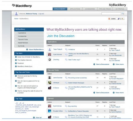 從某種程度而言,MyBlackBerry并不是一個(gè)真正的社交網(wǎng)站,而更像一個(gè)用戶留言板。網(wǎng)站具有一定的針對性,允許使用同型號設(shè)備的用戶進(jìn)行交流。例如,使用BlackBerry