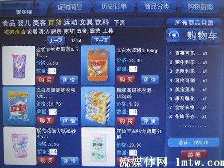 記者在家樂福IPTV購物平臺上看到,商品的種類相當豐富,按日常用到的分成了食品、嬰兒、美容、百貨、運動、文具、飲料幾個大類,而每一類里又分成不同的小類,比如美容類里又分護膚、清潔、男士、彩妝、紙巾等小類。其價格與在家樂福購物相同,并且還有不少產(chǎn)品在打折。滿118元即可免費配送,對于沒有時間、精力逛超市的人來講,可以說相當方便。