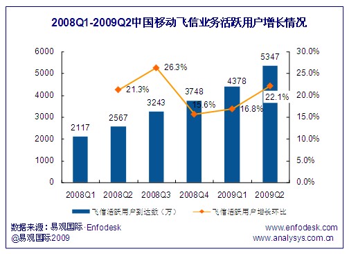 飛信用戶到達數(shù)的增長帶來了活躍用戶的穩(wěn)步提升,截止到2009年第2季度,飛信活躍用戶達到了5347萬,與2008年同期相比增長超過108.3%。由于一方面飛信到達數(shù)增長環(huán)比從2008年第2季度持續(xù)下跌,在2009年第2季度才止跌反彈,相比另一方面飛信活躍用戶的增長環(huán)比始終保持在15%以上,且從2008年第4季度開始飛信活躍用戶增幅持續(xù)擴大,因此近期飛信業(yè)務(wù)用戶活躍度表現(xiàn)出良好的增長勢頭。