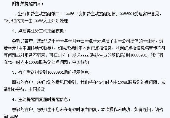 為保護(hù)消費(fèi)者合法權(quán)益,提高增值業(yè)務(wù)消費(fèi)的透明度,中國移動出臺了《關(guān)于實(shí)施業(yè)務(wù)扣費(fèi)主動提醒服務(wù)和規(guī)范業(yè)務(wù)訂購“二次確認(rèn)”服務(wù)的通知》。通知要求各省公司在2010年8月30日前完成全面實(shí)施全網(wǎng)和本地短信、彩信、本地IVR點(diǎn)播業(yè)務(wù)二次確認(rèn)的工作。