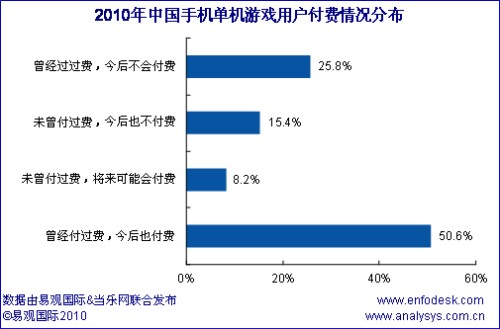 根據(jù)調(diào)研顯示,手機單機游戲中,有76.4%的用戶都有過付費經(jīng)歷,但有25.8%的用戶表示今后將不在付費,出現(xiàn)這種現(xiàn)象原因有多種,主要還是存在損害用戶行為經(jīng)常發(fā)生,外加上眾多與PC交叉用戶的涌入,而這些用戶中免費的、盜版的、破解的成為他們的首選,因此預計未來單機游戲的付費比例還將下降。