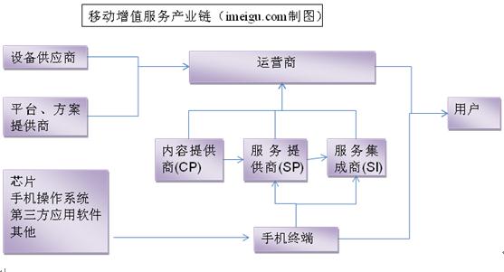 中國電信,中國移動,中國聯(lián)通是中國的三大電信運營商。移動增值服務(wù)和移動支付解決方案已構(gòu)成了移動運營商的兩大收入來源。移動增值業(yè)務(wù)是包括所有增進(jìn)移動用戶體驗的非話音服務(wù),在中國目前主要的四大移動增值業(yè)務(wù)是:短信、彩信、WAP和彩鈴業(yè)務(wù)。移動增值業(yè)務(wù)的產(chǎn)業(yè)鏈如下圖所示: