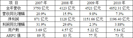 中國移動(dòng)2007年-2010年年度業(yè)績對比