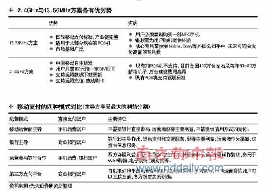 對此,國金證券發(fā)布了一份研究報告稱,相對于13 .56MHz方案而言,2.4GHz方案在推廣上有先天的優(yōu)勢。畢竟13.56M H z方案必須對手機重新設計,需要等待手機產(chǎn)業(yè)鏈對13.56M H z的逐步支持,時間周期較長;同時,更換13.56M H z手機帶來的重置成本無論是由用戶承擔還是由運營商承擔都是一筆高額的費用,推廣難度較高。而2.4G H z方案僅需更換SIM卡便可完成對手機的改造,不用等待終端產(chǎn)業(yè)鏈的成熟;同時改造成本低,便于運營商進行促銷推廣。