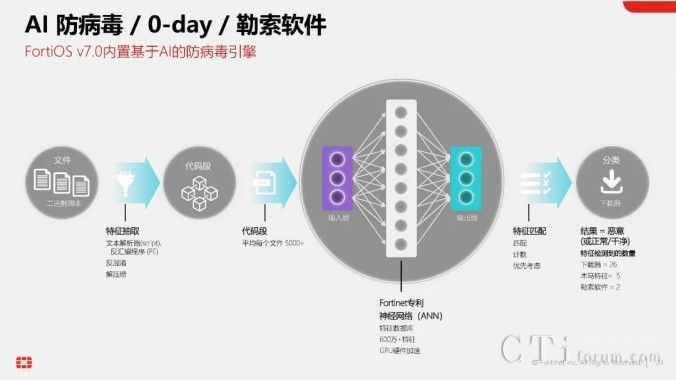目前,AI技術(shù)已深度融入Fortinet的數(shù)十種產(chǎn)品與方案中。在最新版的統(tǒng)一網(wǎng)絡(luò)安全操作系統(tǒng)FortiOS 7.6中,就已經(jīng)內(nèi)置了由FortiGuard AI實驗室研發(fā)的基于AI的防病毒引擎。該引擎運用神經(jīng)網(wǎng)絡(luò)技術(shù),學(xué)習(xí)并區(qū)分海量病毒文件與正常文件,通過分類打分的方式,實現(xiàn)對未知文件與病毒的精準(zhǔn)判斷,無需依賴傳統(tǒng)的病毒特征庫。因此,F(xiàn)ortinet的FortiGate等產(chǎn)品在防病毒方面擁有雙引擎加持,既有傳統(tǒng)的基于病毒特征庫的防病毒引擎,又有基于AI的下一代防病毒引擎(Anti-virus NGAV),雙重保障,安全無憂。
