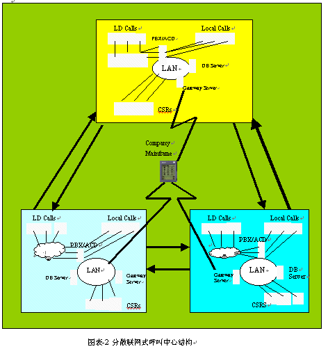 。。建立內(nèi)部專用網(wǎng)的目的是有效地實(shí)現(xiàn)各呼叫中心之間的同級(jí)來(lái)話路由,使來(lái)話的語(yǔ)音信息和數(shù)據(jù)信息能在各個(gè)呼叫中心之間流轉(zhuǎn)。通常情況下,這種形式的呼叫中心可以以一種預(yù)先確定的標(biāo)準(zhǔn),有效地分配溢出的來(lái)話。這一類型的來(lái)話路由分配在虛擬呼叫中心中則沒(méi)有被考慮進(jìn)去。