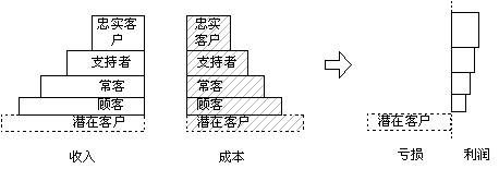 從圖中可以很清楚的看出客戶管理工作的內(nèi)容:層次寬度(每個層次客戶的數(shù)量)和層次的高度(每個層次客戶的平均贏利水平)。