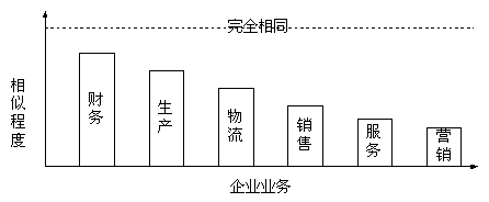很顯然,企業(yè)間業(yè)務的相似程度越高,采用商用軟件的有效率越高,企業(yè)在采用商用軟件的時候軟件的客戶化定制就越少,實施的成功率越高。財務軟件是目前商用軟件通用最有效的企業(yè)管理軟件就是明證。從圖中可以看出前面的幾種業(yè)務,是 傳統(tǒng)ERP軟件支持的功能;而后面的銷售、服務和市場是目前CRM軟件所要實現(xiàn)的功能。如果說,企業(yè)采用現(xiàn)有的ERP商品套件來滿足企業(yè)運營管理的需要還需要30%的客戶化工作,那么如果采用商用的CRM軟件,軟件廠商提供的軟件要應用于企業(yè),就需要更多的客戶化工作,這個比例幾乎接近于企業(yè)自己開發(fā)。