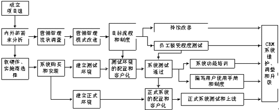 一個(gè)CRM系統(tǒng)的建設(shè)所經(jīng)過(guò)的歷程,可以用圖1所示。漢普管理咨詢(xún)(中國(guó))有限公司的CRM系統(tǒng)的實(shí)施就是按照這個(gè)路線進(jìn)行的,主要從管理的調(diào)整和信息系統(tǒng)的建設(shè)兩個(gè)方面著手。
