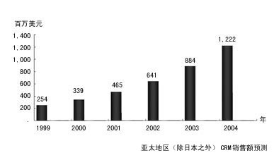 亞太地區(qū)正在成為CRM應(yīng)用軟件的新興市場。1999年亞太地區(qū)CRM市場的年增長率達33.5%。其中中國CRM市場是除日本外最具發(fā)展?jié)摿Φ氖袌觥nA(yù)計到2004年,中國CRM市場的復(fù)合年平均增長率為60%。