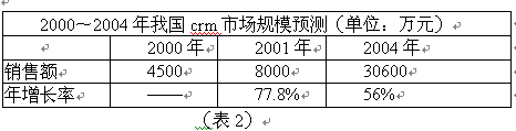 國(guó)內(nèi)CRM市場(chǎng)經(jīng)過一段時(shí)間的快速增長(zhǎng),2000年銷售額達(dá)到4500萬元左右。2001年市場(chǎng)情況將更好,預(yù)計(jì)銷售額將是上年的兩倍左右。CCID根據(jù)大量調(diào)查分析,對(duì)我國(guó)CRM市場(chǎng)規(guī)模作出如下預(yù)測(cè):