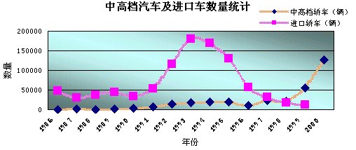 第三階段:1999年以后的快速增長階段。1999年中高檔汽車產(chǎn)銷量結(jié)束了六年的徘徊局面,首次突破5萬輛,比上年增長了1.5倍,在轎車市場中的占有率升到9.7%。2000年中高檔汽車的產(chǎn)量又實(shí)現(xiàn)翻倍,增長率為232.46%,年產(chǎn)量達(dá)到127,676臺(tái)。進(jìn)口中高檔汽車數(shù)量也超過了3萬臺(tái),僅日本車的進(jìn)口量就達(dá)23,502臺(tái)。