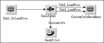 由于不同的源數(shù)據(jù)中可能包含同一個客戶的信息,因此采用Hashed File Stage HF_khjbxx存放輸出結(jié)果,相同客戶的信息根據(jù)客戶編碼覆蓋前面產(chǎn)生的信息,避免了重復(fù)的客戶信息。從不同源數(shù)據(jù)庫取得客戶信息,根據(jù)數(shù)據(jù)的真實(shí)性依次進(jìn)行處理后,生成的客戶信息全部保存在一個Hash文件中,最后從Hash文件中取出結(jié)果數(shù)據(jù)裝載到目標(biāo)數(shù)據(jù)庫中。